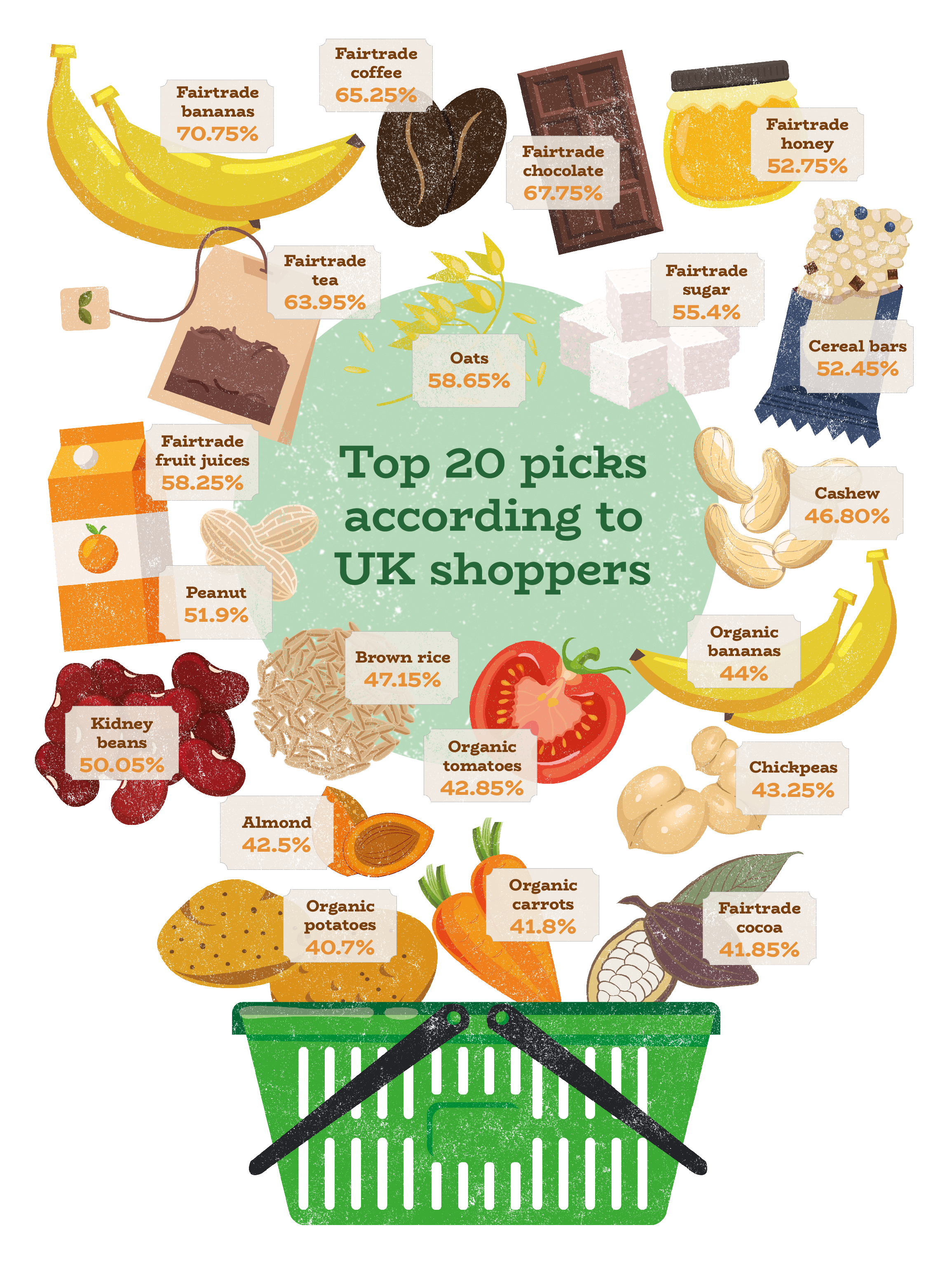 Fairtrade, organic, taste, and health were all dominant in weekly food purchases. Fairtrade bananas, chocolate, coffee, and tea took the top spots.